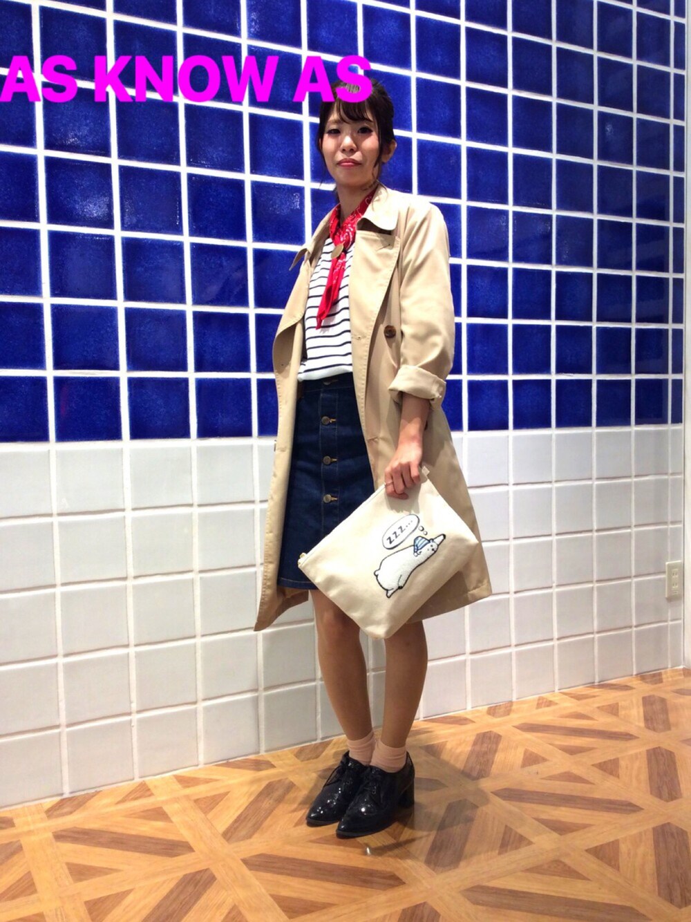 トレンチCOとボーダートップスで春らしく🌸 沖縄は最近、急に寒くなったので朝夕はCOが必要になってきましたね❤️(^-^) こちらのトレンチは丈が比較的短い為、身長のあまり高くない方でも合わせやすく人気アイテムとなっております😄