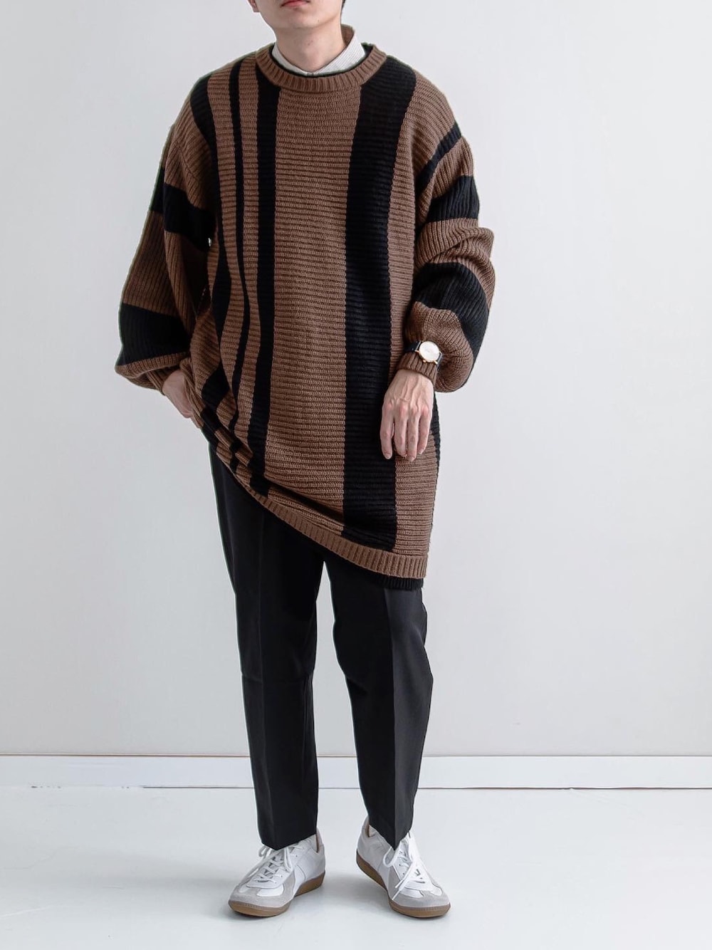 ゆうげんのニット/セーター「モヘアタッチ配色ストライプスーパーオーバーサイズニット」を使ったコーディネート