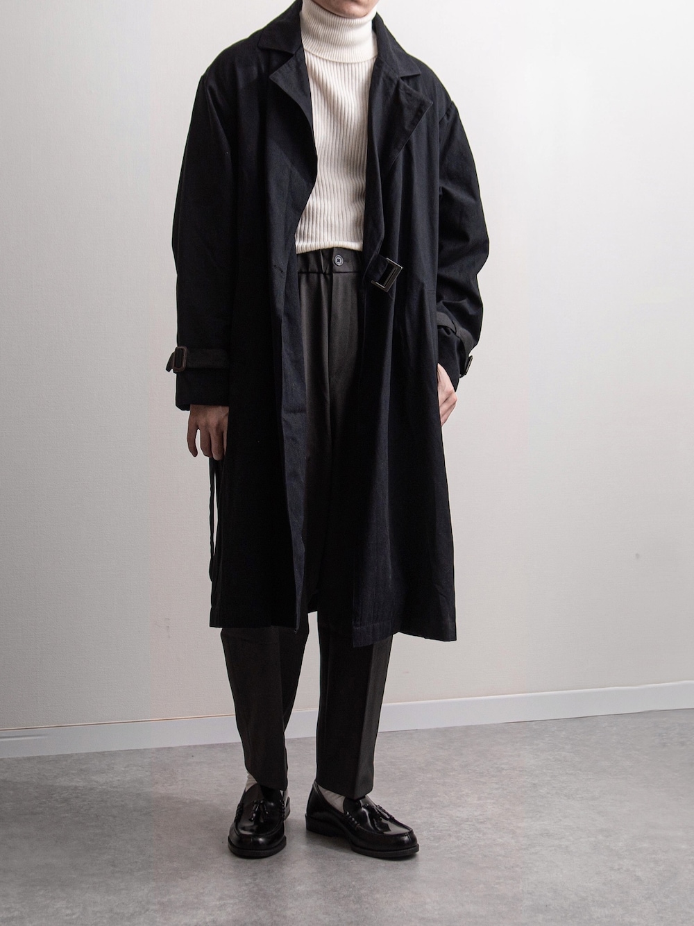 ゆうげんのチェスターコート「オーバーサイズピーチツイルタイロッケンコート」を使ったコーディネート
