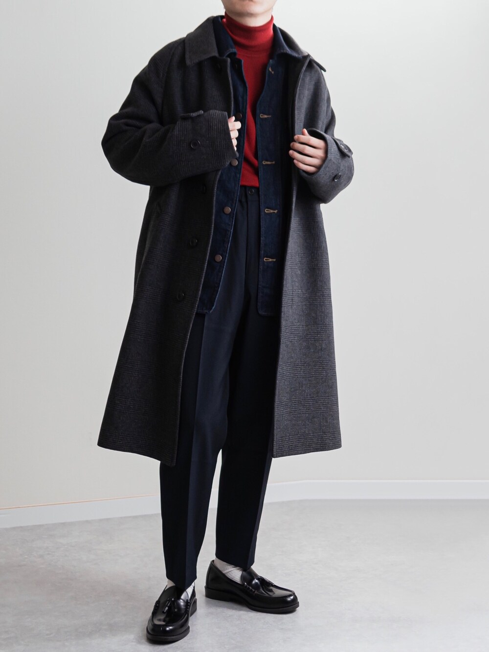 ゆうげんのステンカラーコート「シングルブレステッドコート」を使ったコーディネート
