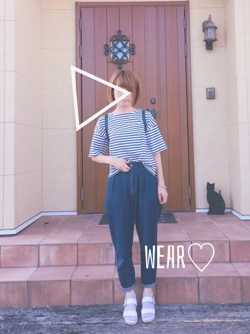 お久しぶりです。 ボーダー続けて、ハニーズの青ボーダー😋全部去年買ったやーつー。ポイントは前だけインしてるとこ😂 ボーダーにはピンクチークが映える🤤💓
