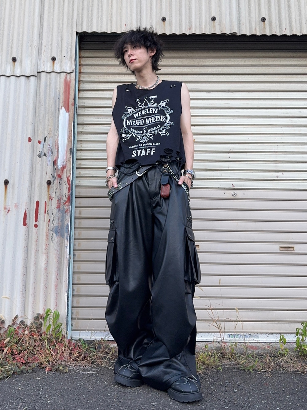 ともき / 畳屋さんのその他パンツ「wide baggy faux leather parachute cargo trouser/ ワイドバギーPUレザーパラシュートカーゴパンツ」を使ったコーディネート