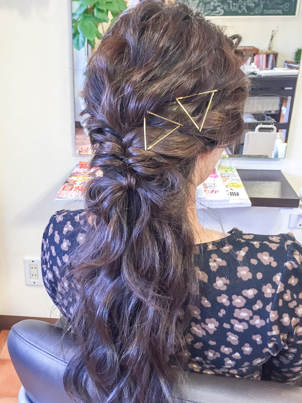 ストレートアイロンでウェーブにして、ロープ編みとリボンで可愛く♡ 金ピンで三角♡