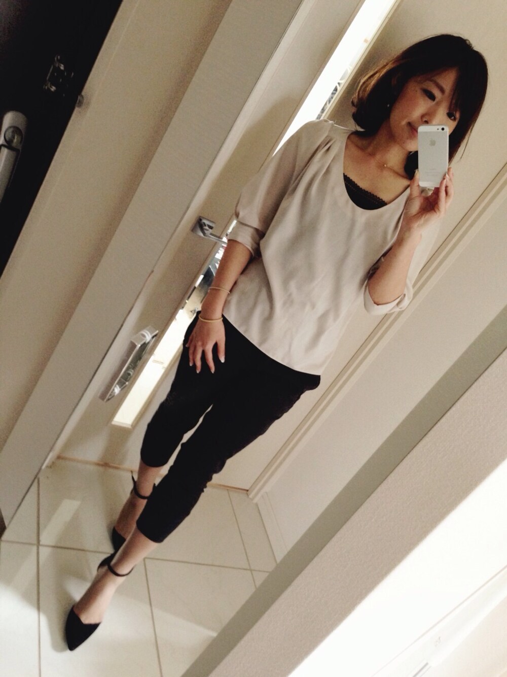 初。 光沢ブラウス スウェットパンツ ピンヒールアンクルストラップパンプス