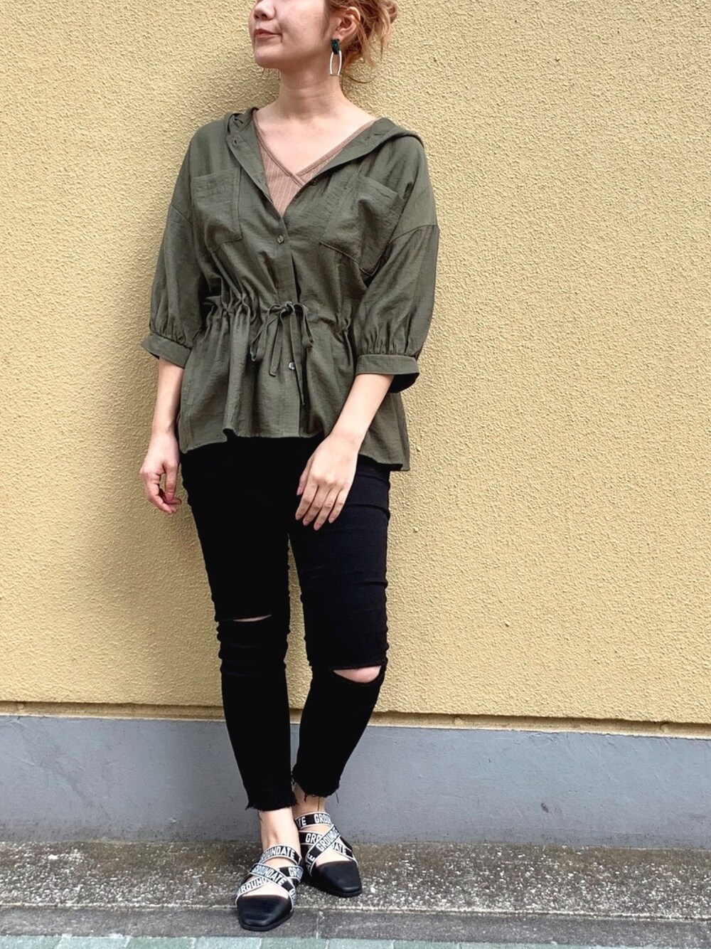 manaのシャツ/ブラウス「ウエストドロストフードブラウス」を使ったコーディネート