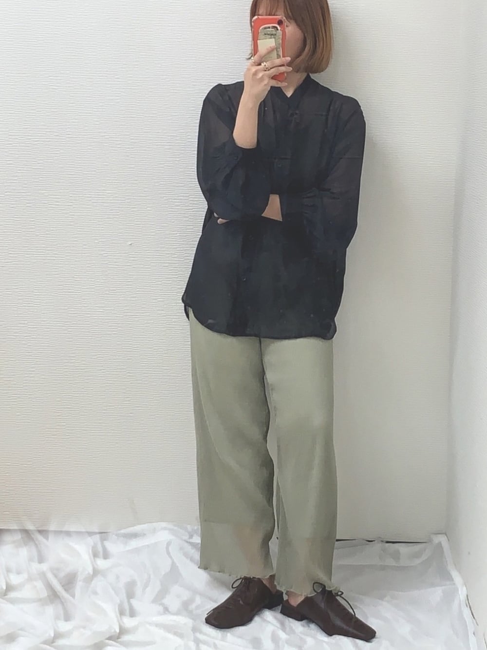 manaのシャツ/ブラウス「シフォンジョーゼットノーカラーシャツ」を使ったコーディネート