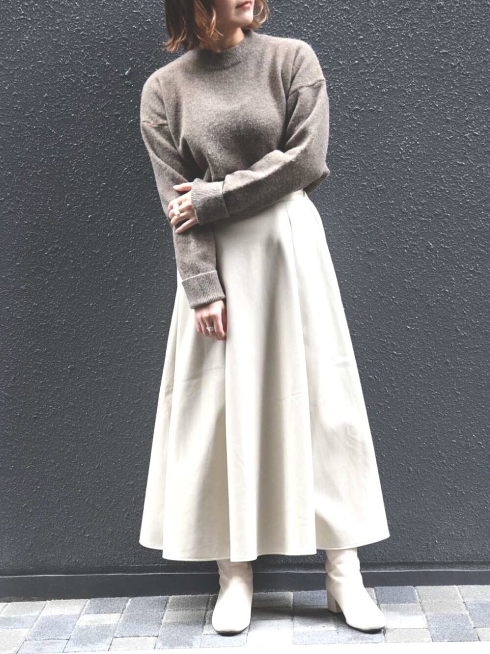 manaのスカート「フェイクレザーロングフレアスカート」を使ったコーディネート
