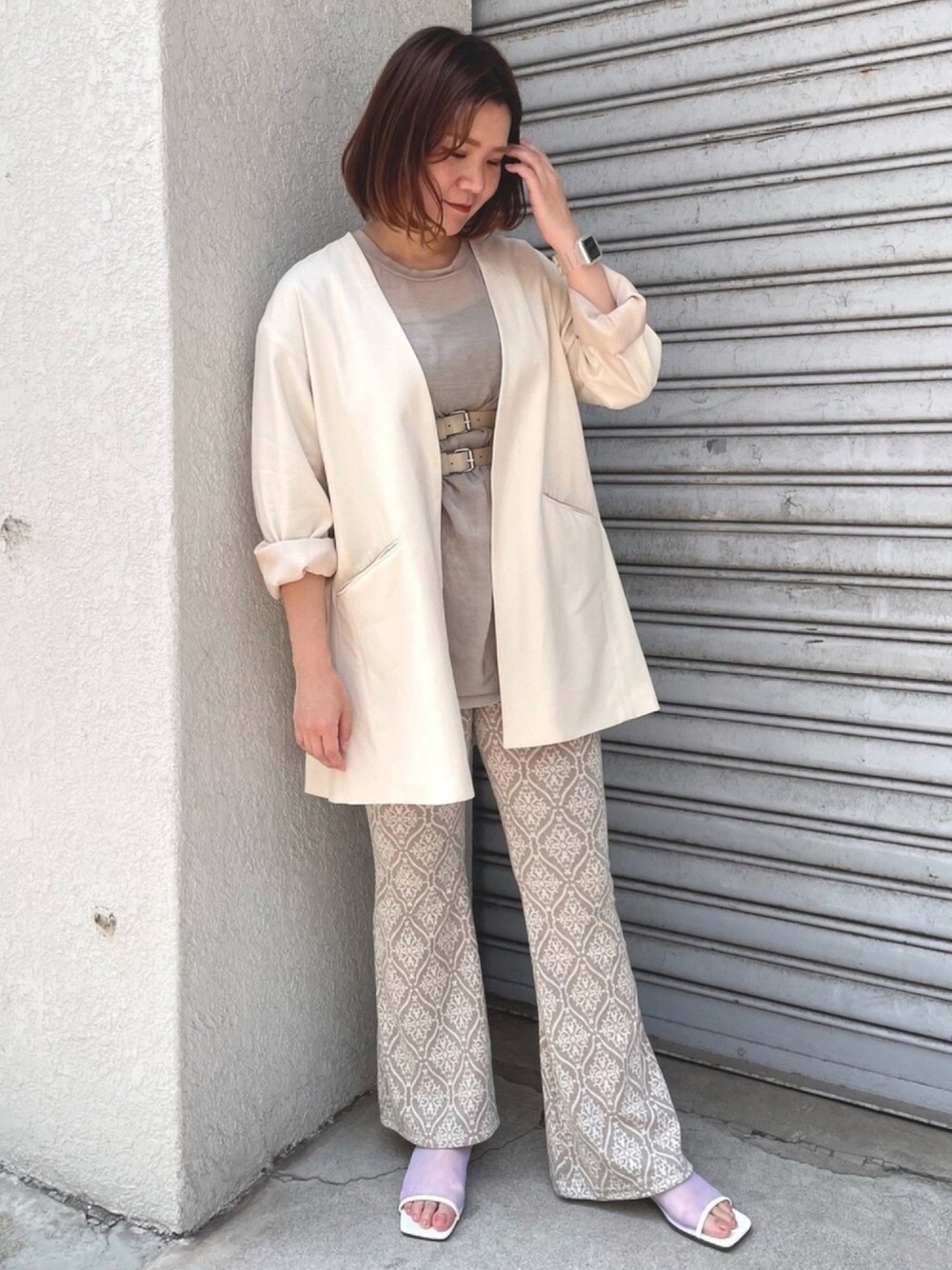 manaのノーカラージャケット「セットアップノーカラーラフジャケット」を使ったコーディネート
