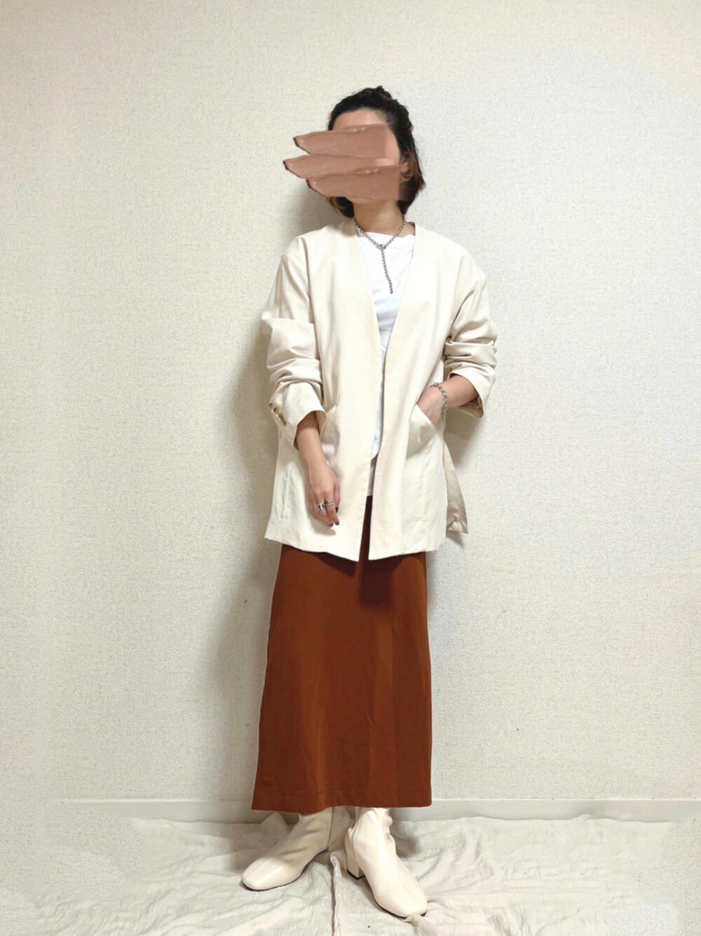 manaのノーカラージャケット「セットアップノーカラーラフジャケット」を使ったコーディネート