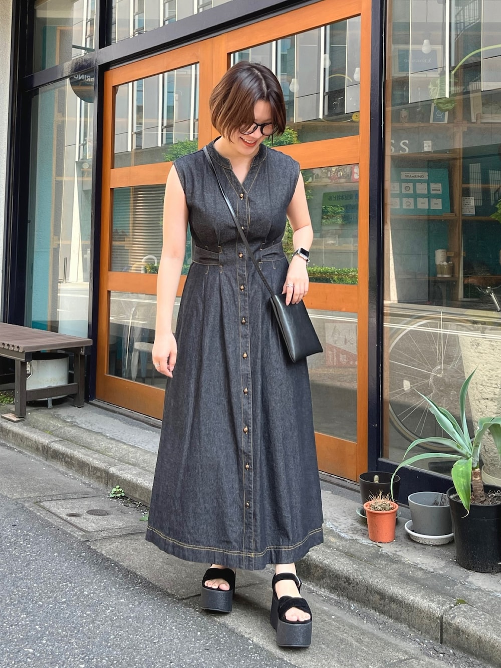 manaのワンピース「ノースリーブデニムワンピース」を使ったコーディネート