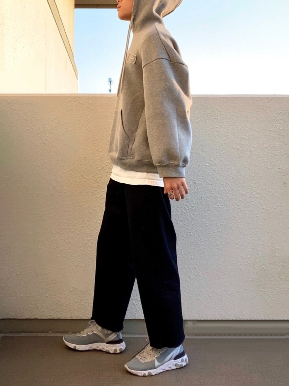こんにちは。 見ていただきありがとうございます。 たまにはパーカーでも。子供っぽく見えてしまいがちなので毛嫌いしてました。韓国感やストリートに寄せるといいかなと。出来てますかね? reactは歩きやすさ◎です。少しスポーティなデザインですのでコーデの外しに使えます。 白Tレイヤードは重宝しますね。 よろしければフォローやお気に入り、いいねしていただければ喜びますしモチベになります!😆