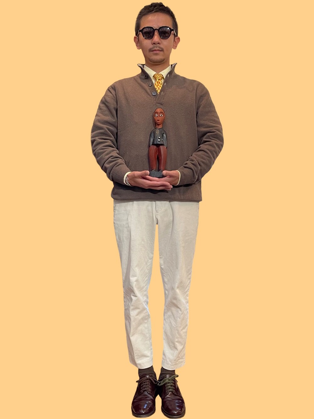 本日はイエローベースにブラウンの組み合わせのマックス氏。ネクタイの木の葉柄や靴紐を色違いにさせたり、微細なところ気を配っている。