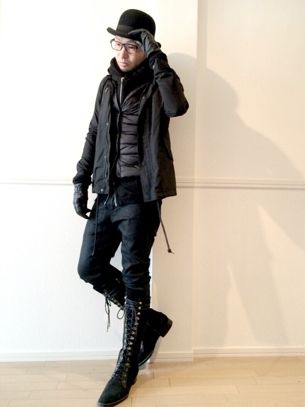 お疲れ様です⤴️(-`ω´-)/ 今回のメンズタグ「 ♯ オールブラック 」が皆さんめちゃめちゃカッコ良くて✨改めてWEARの皆さんのレベルの高さに驚きました❗️ 久々に初心に戻れた気がしました☆ (-`ω´-)♪ 朝投げたのは、真面目な俺としてはちょっとズルしたかな(笑)と思うところもあったので、今度は正真正銘のオールブラックコーデです(-ω☆)ノ と、再アップしては見ましたが(笑)さほど変わり映えのないスタイルですいませんm(_ _)m💦 去年、足を運びまくって出会った「マッキントッシュ フィロソフィー」のスマホ対応のレザーグローブをついに使用しました🎵 今季もコイツにお世話になります✨w