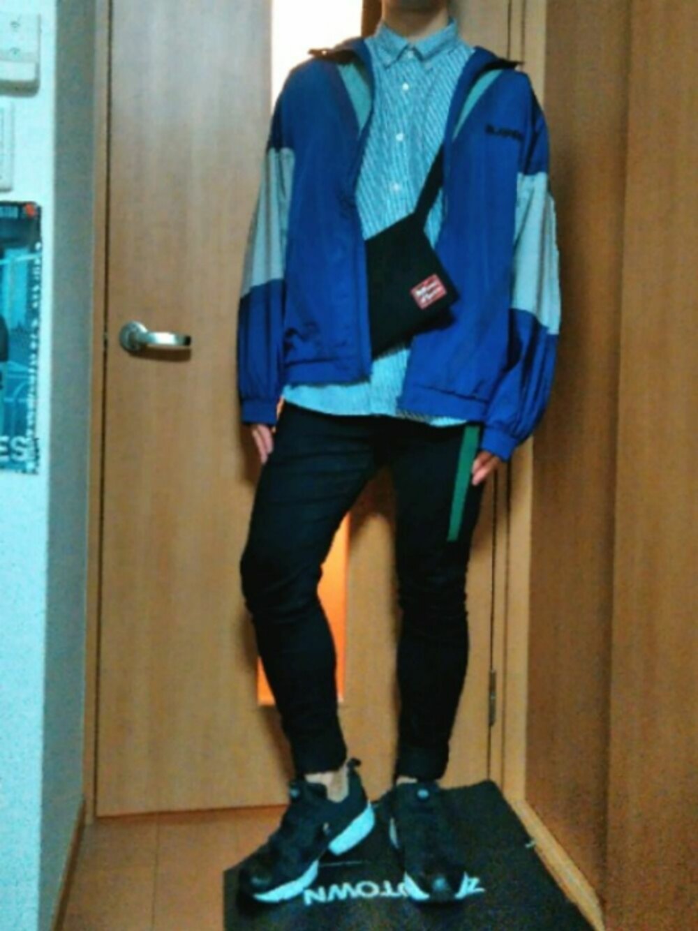 17回目投稿! オーバーサイズナイロンジャケット×ストライプシャツ×黒スキニー×ポンプフューリー ※サイズ アウター: 5 シャツ: XL スキニー: 31