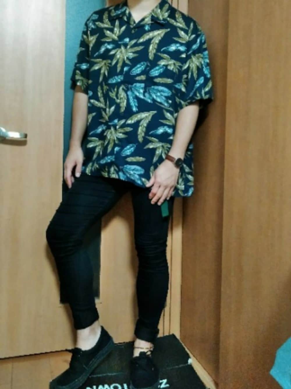 28回目投稿! オープンカラーシャツ(GU)×黒スキニー×VANS ERA ※サイズ シャツ: XL スキニー: 31
