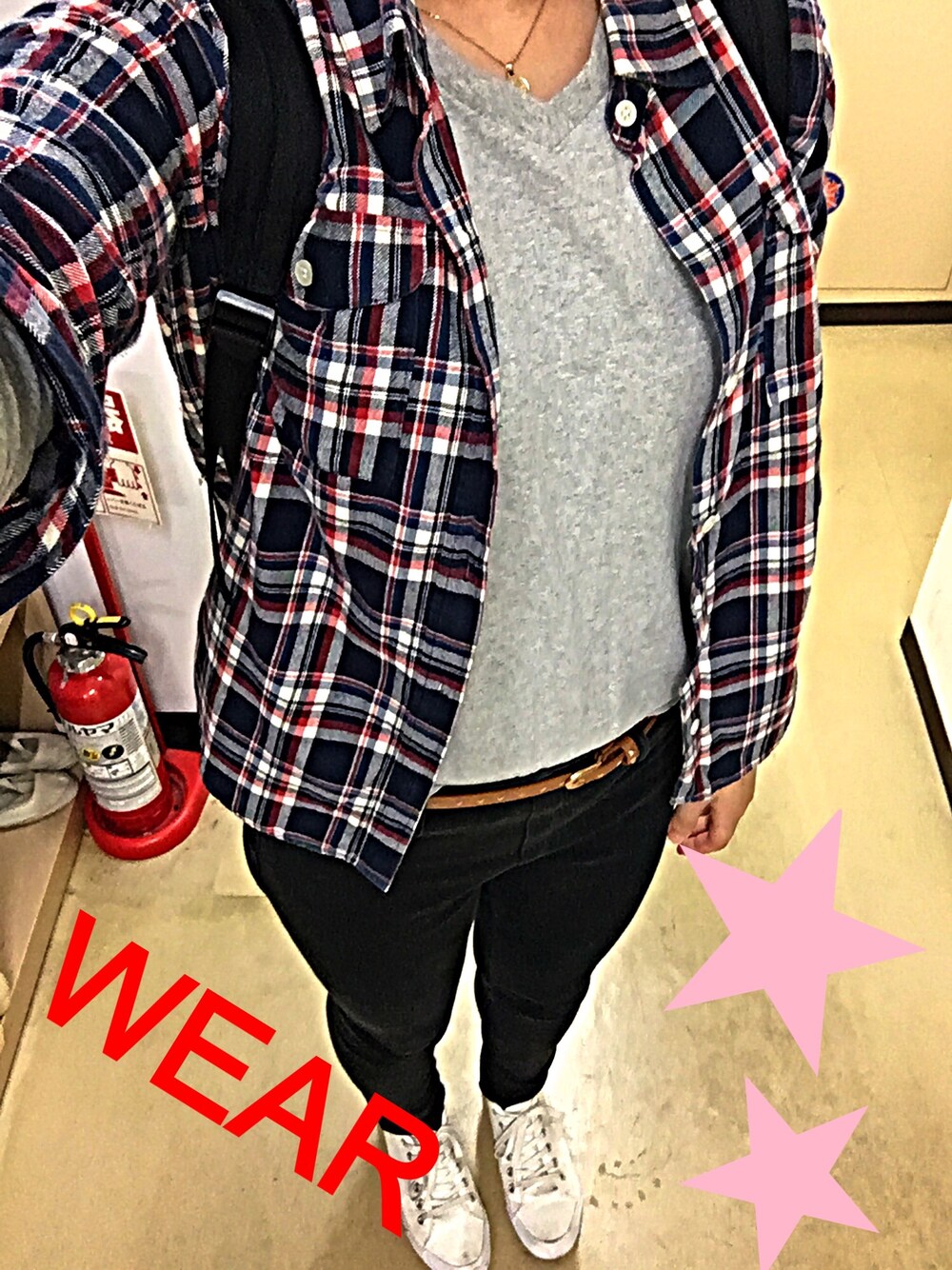 このチェックシャツのカラーリング好きなんすよね〜♡ 赤と紺♡ 穴が開いても縫って着るくらい好き(笑)
