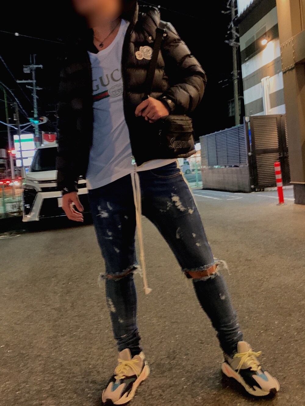 定番のGUCCtをアピールしたいコーデです。半袖は少し寒いですが、モンクレの暖かさでカバーしています🙂 そしてインスタグラムでよく見かけるlakenzieのダメージデニムです😊 無事海外から届いて一安心😌 イージー700とイージーゼブラにすごく合うのでお気に入りです。めちゃくちゃおすすめのブランドです!