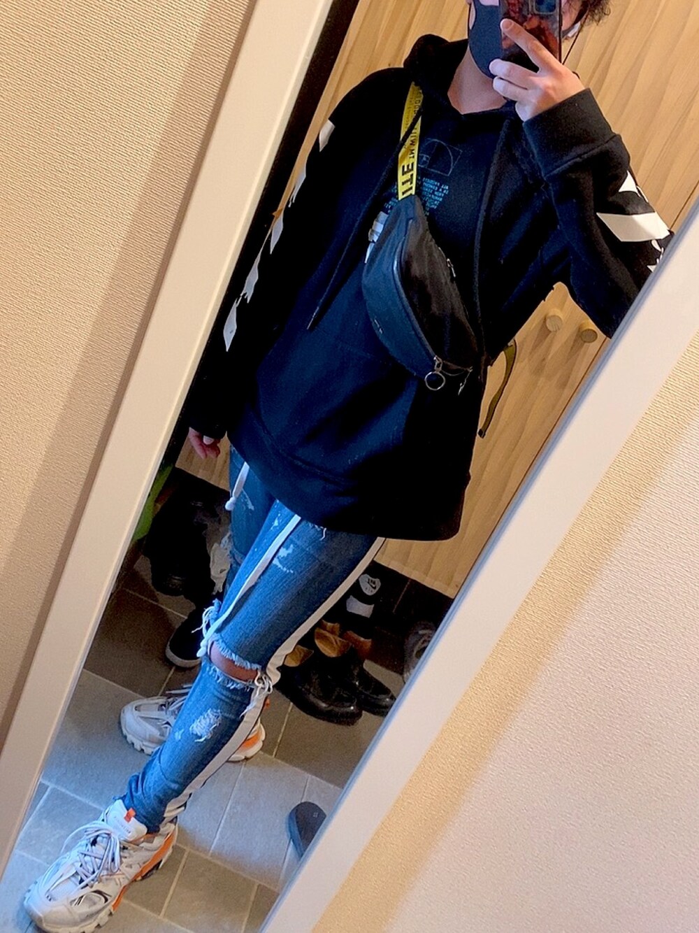 オフホワイトのパーカーを使ったストリートコーデです。 バッグの黄色いベルトがいいアクセントになっています。