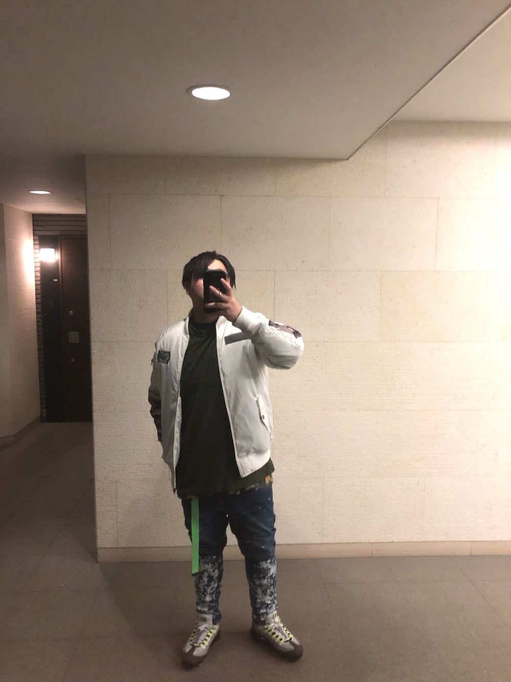 白系のアウターにインナーはカーキのTシャツ足元とベルトにワンポイントで蛍光グリーンを入れました。