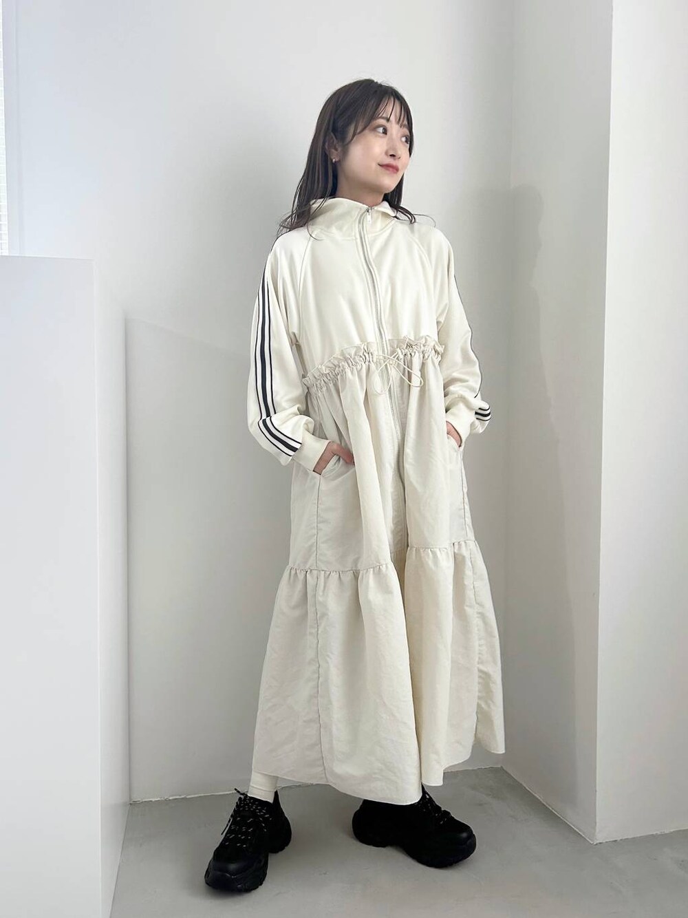 閲覧いただきありがとうございます(^O^) ▷ ワンピース ( Fサイズ ) 異素材ドッキングのデザインが 今年らしくてかわいい1枚 ♡ ウエストのドロストによって シルエットを変化させられます! 着丈はわたしの身長で足首くらいです。 ポケット付きなので便利ですよ^^♩ 参考になれば嬉しいです .. ♡ instagram →