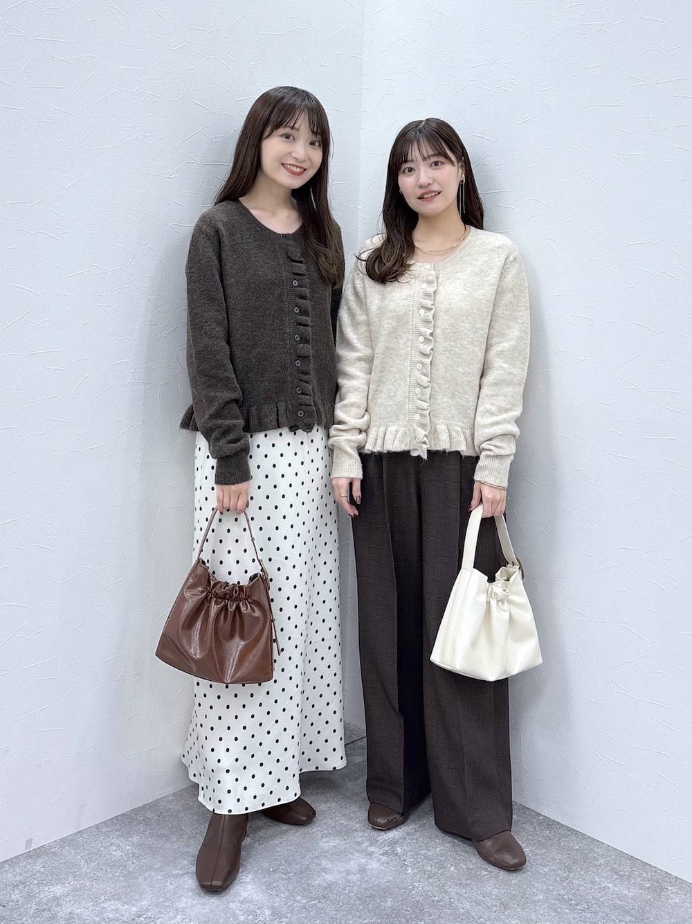 閲覧いただきありがとうございます(^O^) 左 : toyo . / 160cm 骨格ウェーブ 右 : / 150cm 骨格ウェーブ ▷ カーディガン ( Fサイズ ) フロントと裾のフリルがポイントのカーディガン ♡ 着丈はおしりに当たるくらいです! チクチク感も私は気にせずに着れました✨ コンパクトすぎない程よいゆとりのある サイズ感なので着やすいですよ^^◎ 参考になれば嬉しいです .. ♡ instagram →