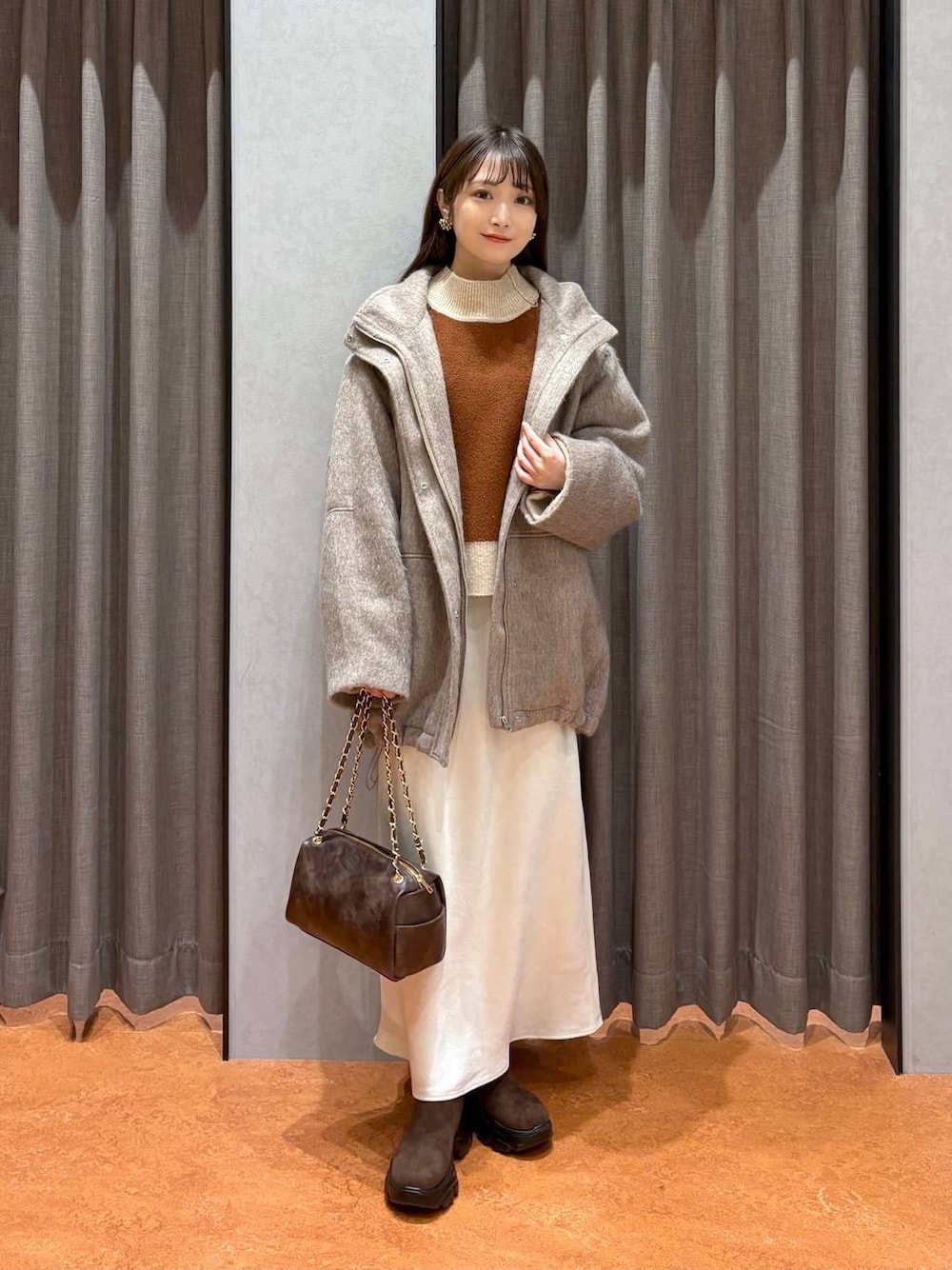 閲覧いただきありがとうございます(^O^) ▷ アウター ( Fサイズ ) オーバーサイズのシャギーコート ♡ 裾のドロストコードを絞ることで シルエットを変化させられます^^! スタンドネックなので首元まで暖かいです✨ そしてとても軽いですよ◎ ▷ ニット ( Fサイズ ) リバーシブルで着れちゃうニット ♡ 気分によってカラーを変えられるのが いいですよね^^♩ 着丈はおしりに当たるくらいの長さです! ▷ スカート ( Sサイズ ) サテン生地のロングスカート ♡ Sサイズを折らずにおへそ位置で 履いて写真くらいの長さです。 かかとはしっかりと出ますが 足首は覆われるくらいの長さです◎ 参考になれば嬉しいです .. ♡ instagram →