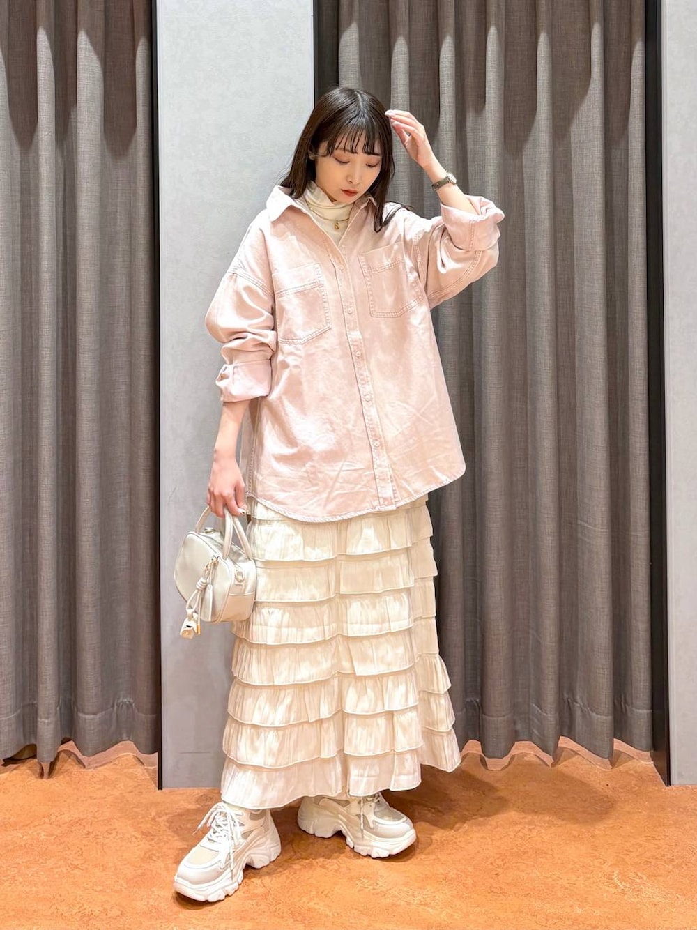 閲覧いただきありがとうございます(^O^) ▷ スカート ( Fサイズ ) 贅沢にフリルが使われているスカート ♡ 一見、ボリュームが出そうに見えますが 履くとシルエットの綺麗さに感動します✨ Aラインシルエットに広がるので綺麗です! ウエストはオールゴムなので楽ちんですよ◎ ▷ シャツ ( Fサイズ ) オーバーサイズのデニムシャツ ♡ ゆったりとしているので 中に薄手のインナーを仕込んでも ごわつかずに着用いただけます^^! 優しい淡いトーンのピンク色なので カラーもの苦手な方でも取り入れやすいです◎ 参考になれば嬉しいです .. ♡ instagram →
