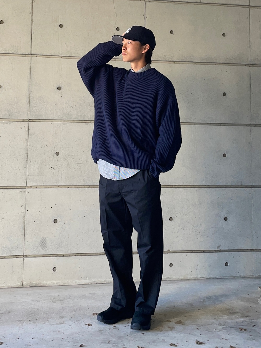 Ryoのニット/セーター「WEB限定 ビッグシルエット 畔編み クルーネックニット/ルーズフィット」を使ったコーディネート