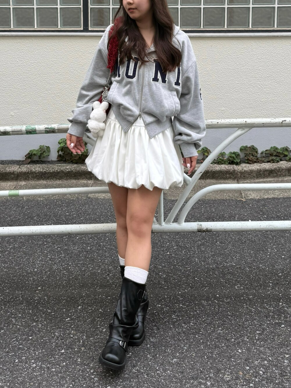 may81o(Remind me and forever 本部)のパーカー「【NUNIFE】【選べる2丈】BIGロゴフードパーカー」を使ったコーディネート