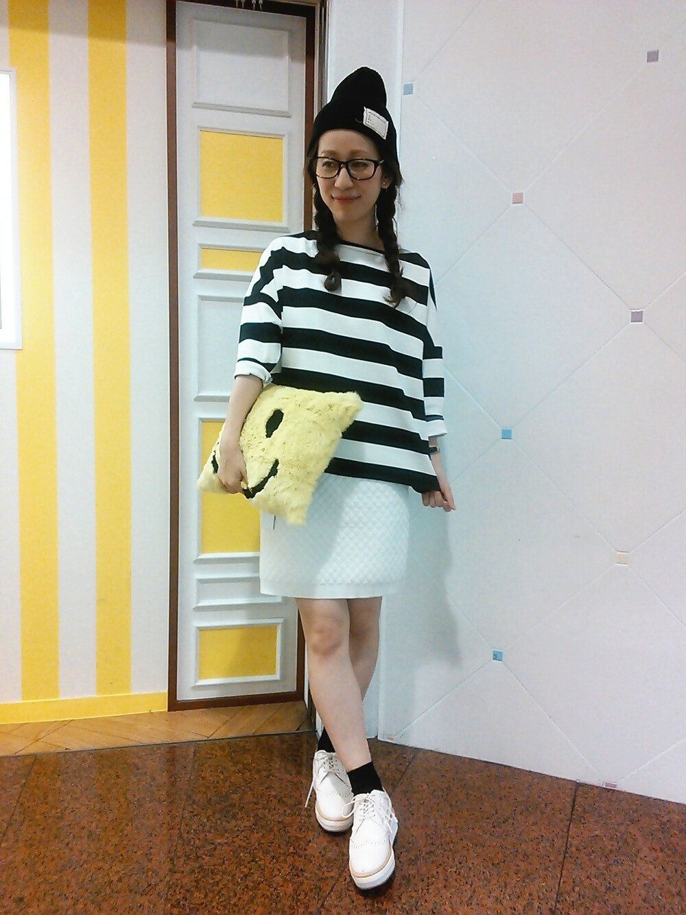 こんにちは! 今日のコーディネートは、ボーダーのトップスを主役に、モノトーンでまとめてみました! 可愛すぎるニコちゃんクラッチと一緒に、秋のお出掛けスタイルです♪