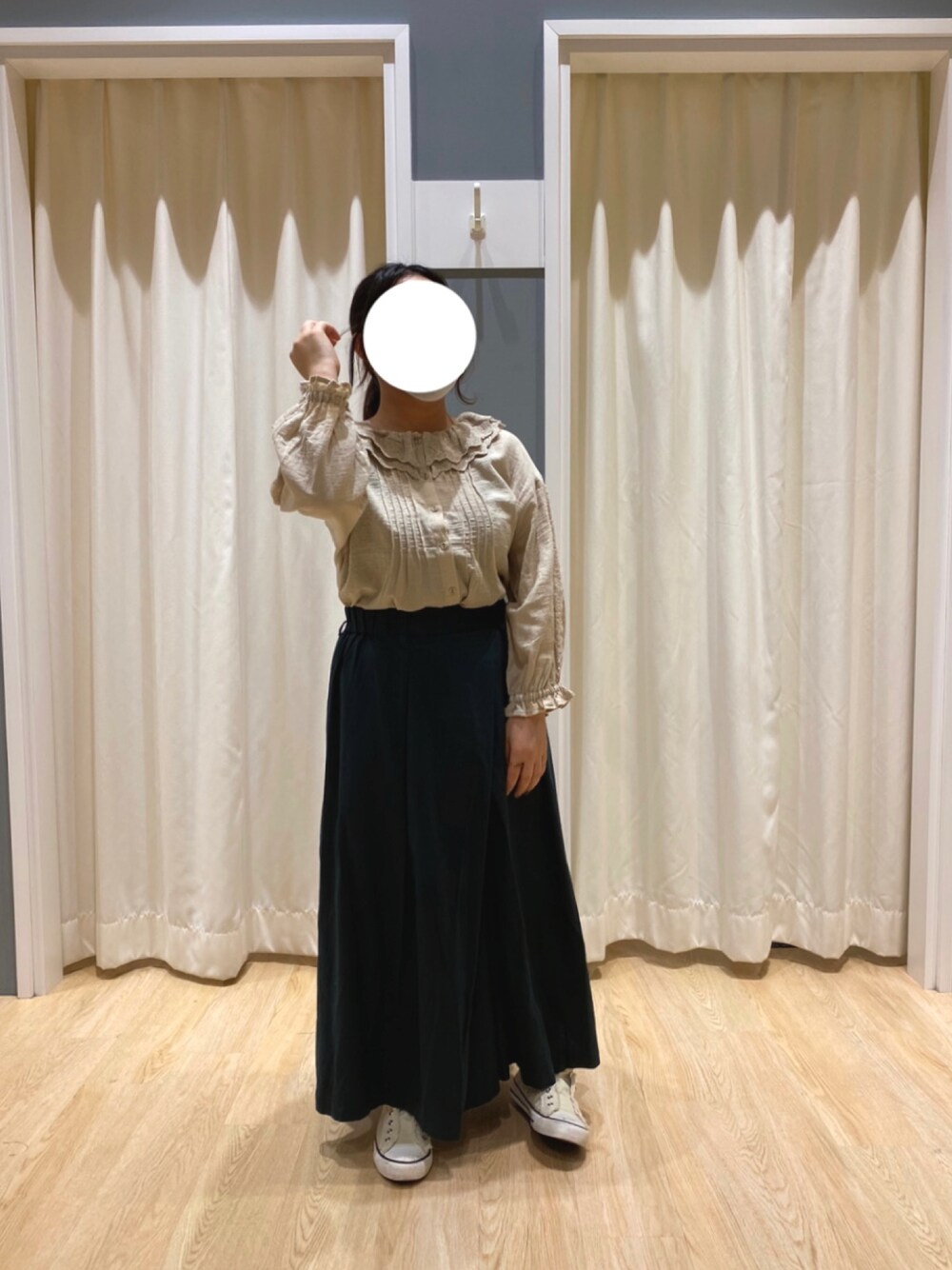 襟元のフリルが可愛らしいブラウスに、 ボリューム感あるグリーンのパンツを合わせた秋コーデです☺︎