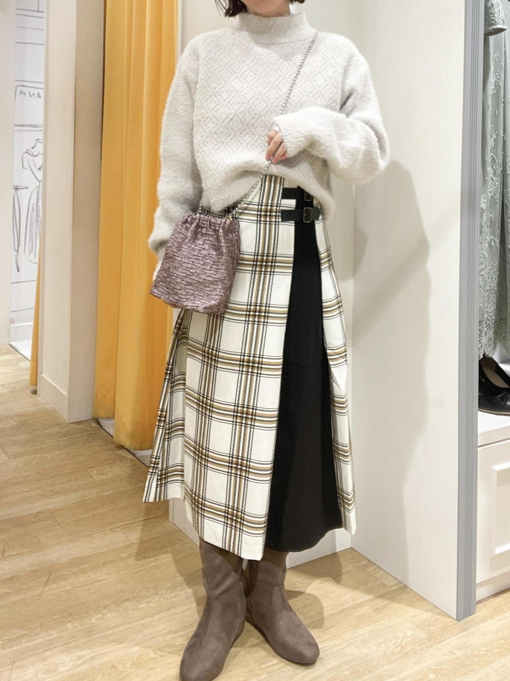 チェックスカートが主役のコーディネート☺︎ 合わせたシャギーニットもふわふわで冬におすすめの1枚です♪