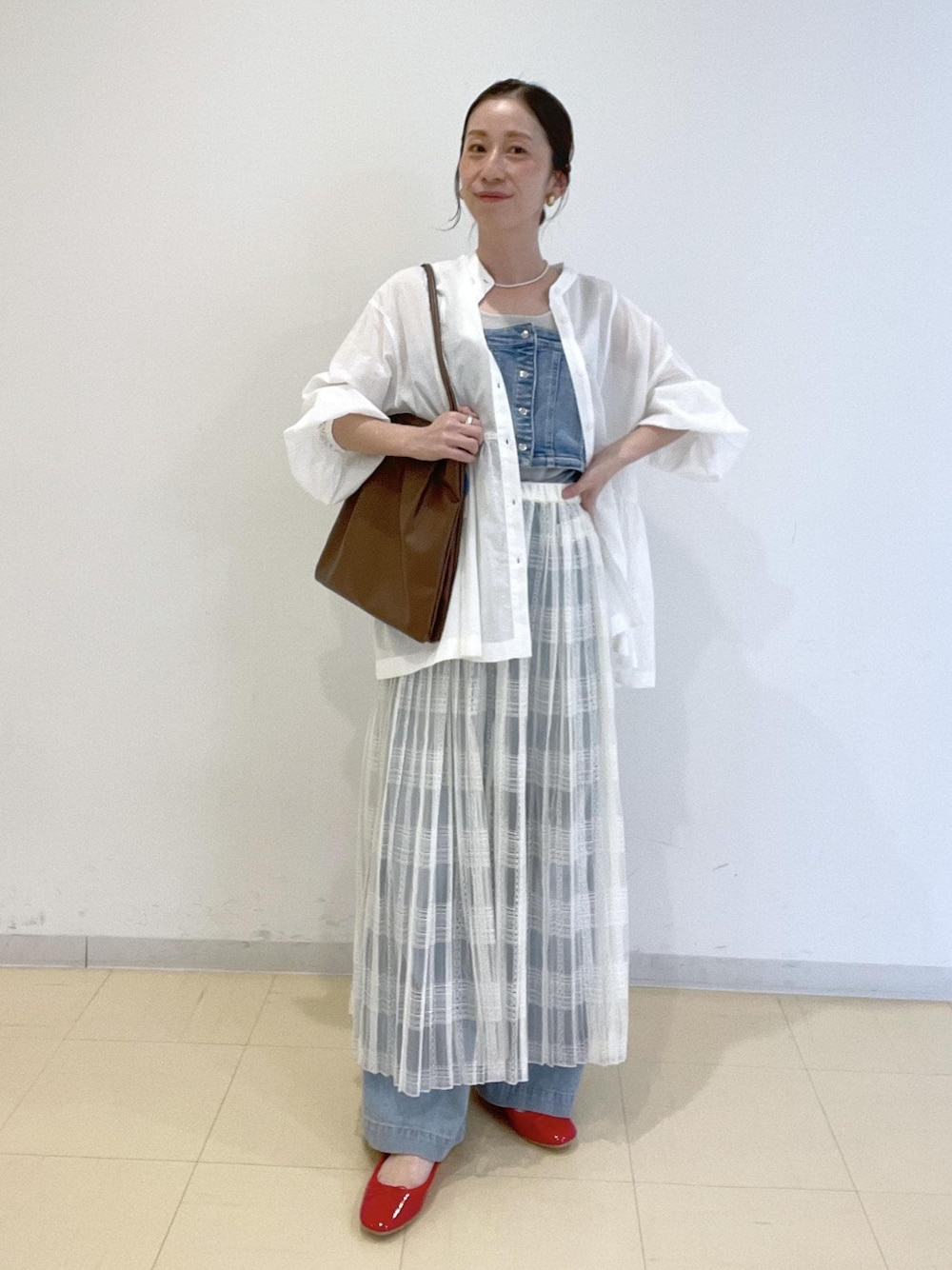 爽やかなカラーを意識したレイヤードコーデです! デニム×ホワイトをテーマに差し色に赤もいれてみました☺︎ 羽織にしているペプラムシャツは、1枚で着ても、羽織にしても使える、おすすめアイテムです♪