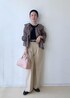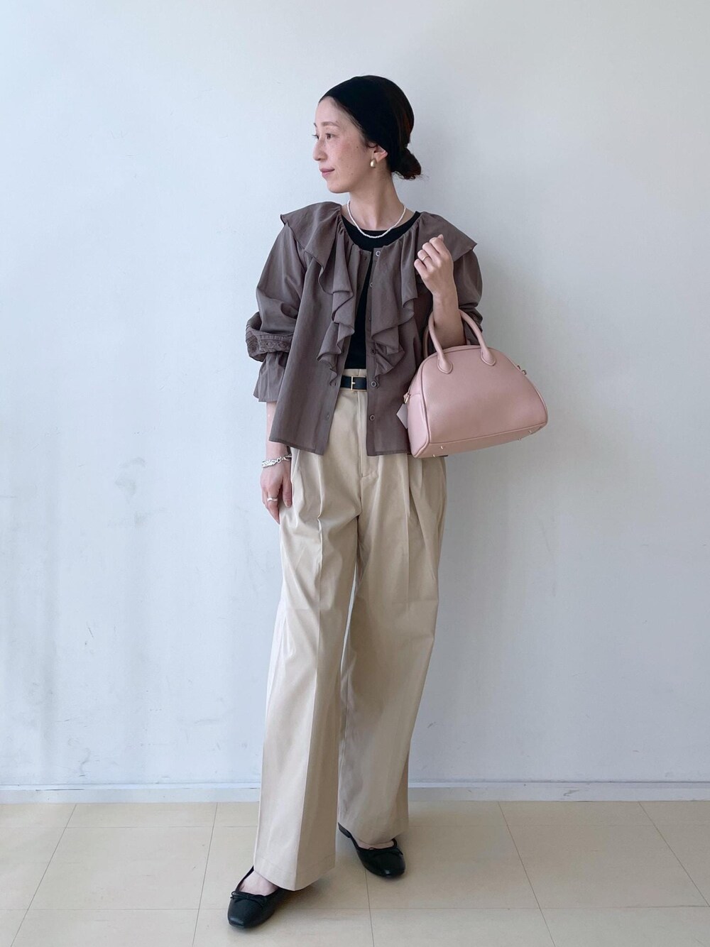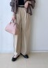 フリルが可愛いいブラウスですが、カラーのトーンをブラウン系でまとめる事で、甘すぎず大人も着やすいです◎ bagはあえてのピンクでポイントに☺︎ トップスも、パンツもさらっとした素材感で、これからの季節にもおすすめです!