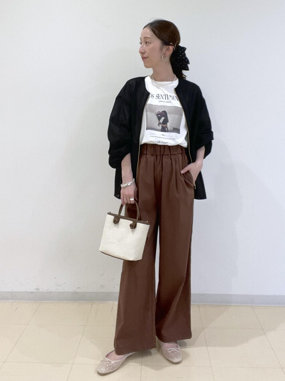これからの季節のお出かけにおすすめコーデ✨ ボトムはウエストゴムのさらっとしたワイドパンツ。 フォトTシャツと合わせて楽ちんカジュアスタイルです! メッシュの羽織りは、朝晩の気温差や日焼け対策にも、、 1枚あると安心です☺︎