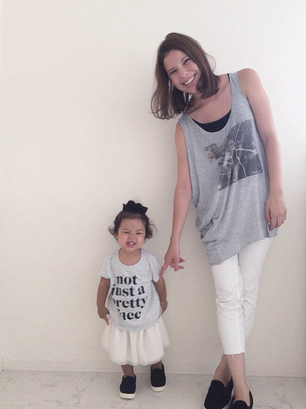 Gray✖️White♡ SarahはTシャツにチュールスカート❤️ママはタンクにホワイトデニムでちょっと変えてみた😆💕 久しぶりにホワイトデニム出して履いたらキツイ💦腰回りから太るタイプだからパンツ履くとよくわかる😱そーゆー時は長めトップスで隠す🙈 最近外で写真撮るとジッとしてないしあまり時間がないのでいつでも撮れる部屋の中撮影に変更📷✨ バタバタしててみんなのところへ行けてないので今から遊びに行きます😊💓 ハート♡・SAVE・コメントいつもありがとうございます💕とっても嬉しいです❤️
