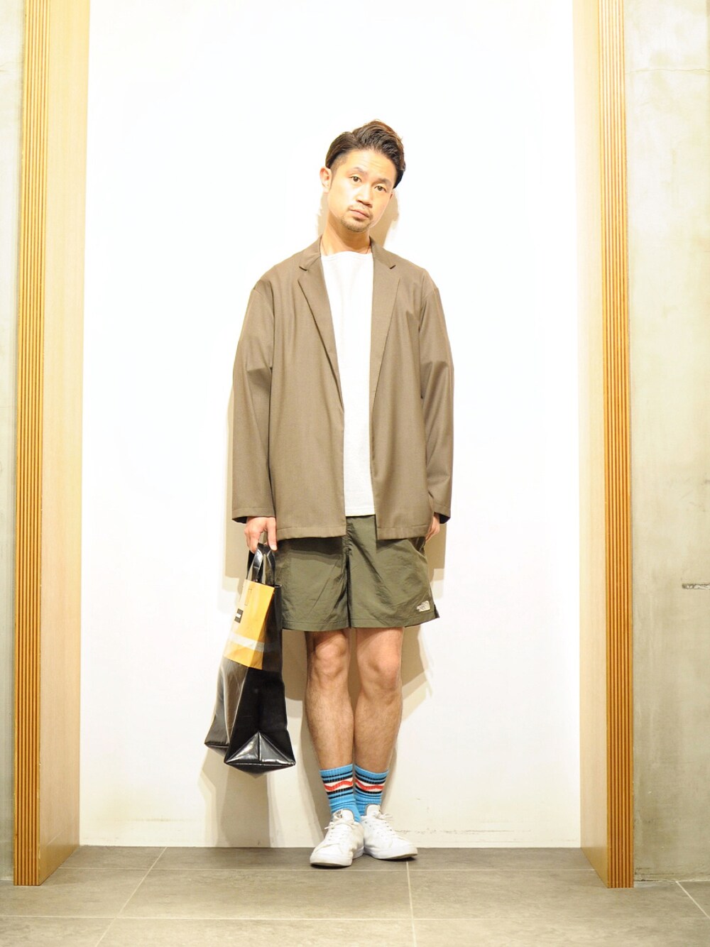カーキ系でまとめた夏ジャケットスタイルです。