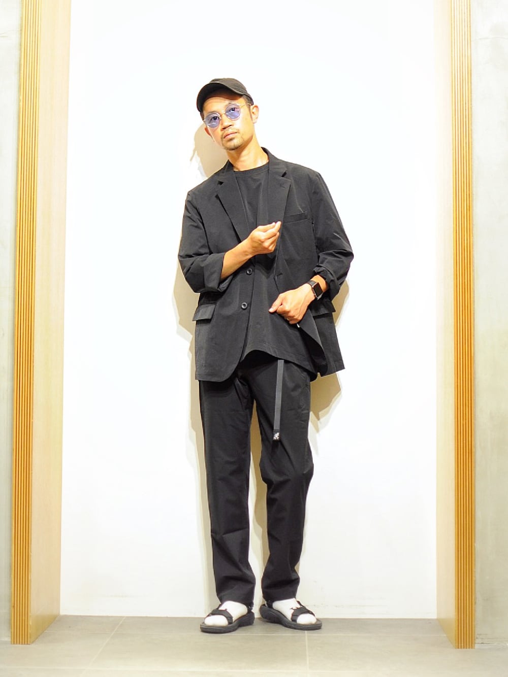 オールブラックコーデ。グラミチのパンツと同素材でセットアップとして着れるジャケットとTEEも本当にオススメ。