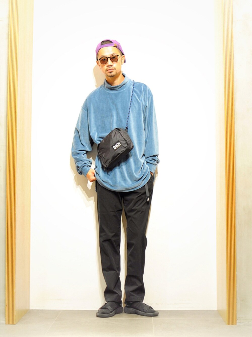 ベロア素材のカットソーが目を引くコーデ。