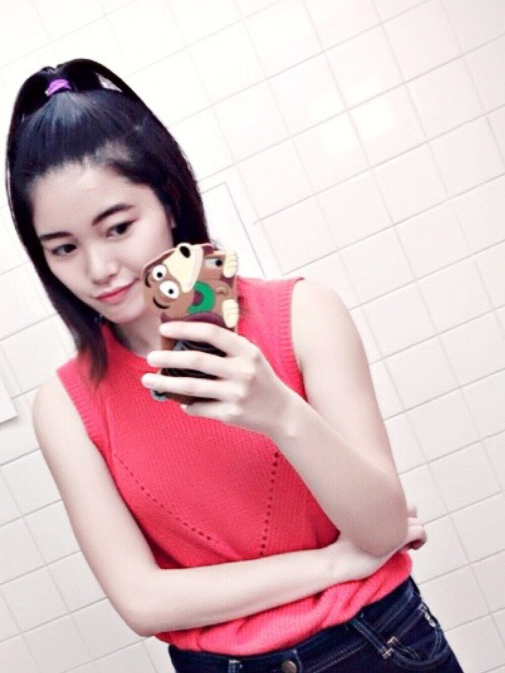 ブルー系のデニムパンツ、レッド系のタンクトップを着用したレディースの夏コーディネートの1枚目の写真