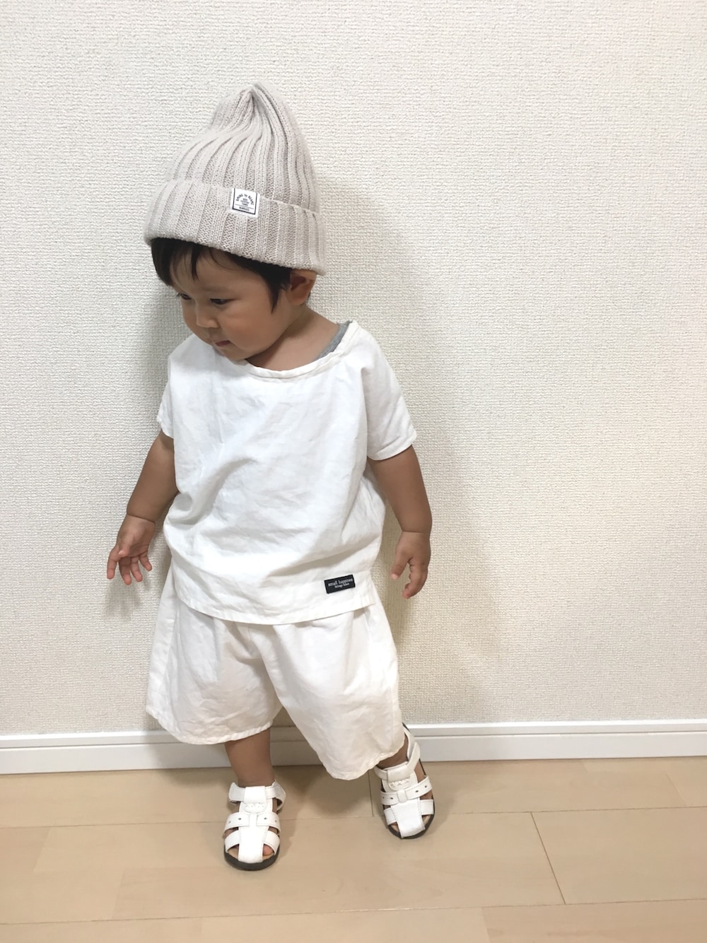 気まぐれ投稿♡ お盆の義実家帰省も終わり ホッとひと息ついています。 息子はプールや水遊びで日焼けして 真っ黒に、、笑 ホワイトでワントーンコーデ✧ 上下ともに手作り✂︎ 簡単な形ですが、、笑 秋はベストを作りたいな〜♡