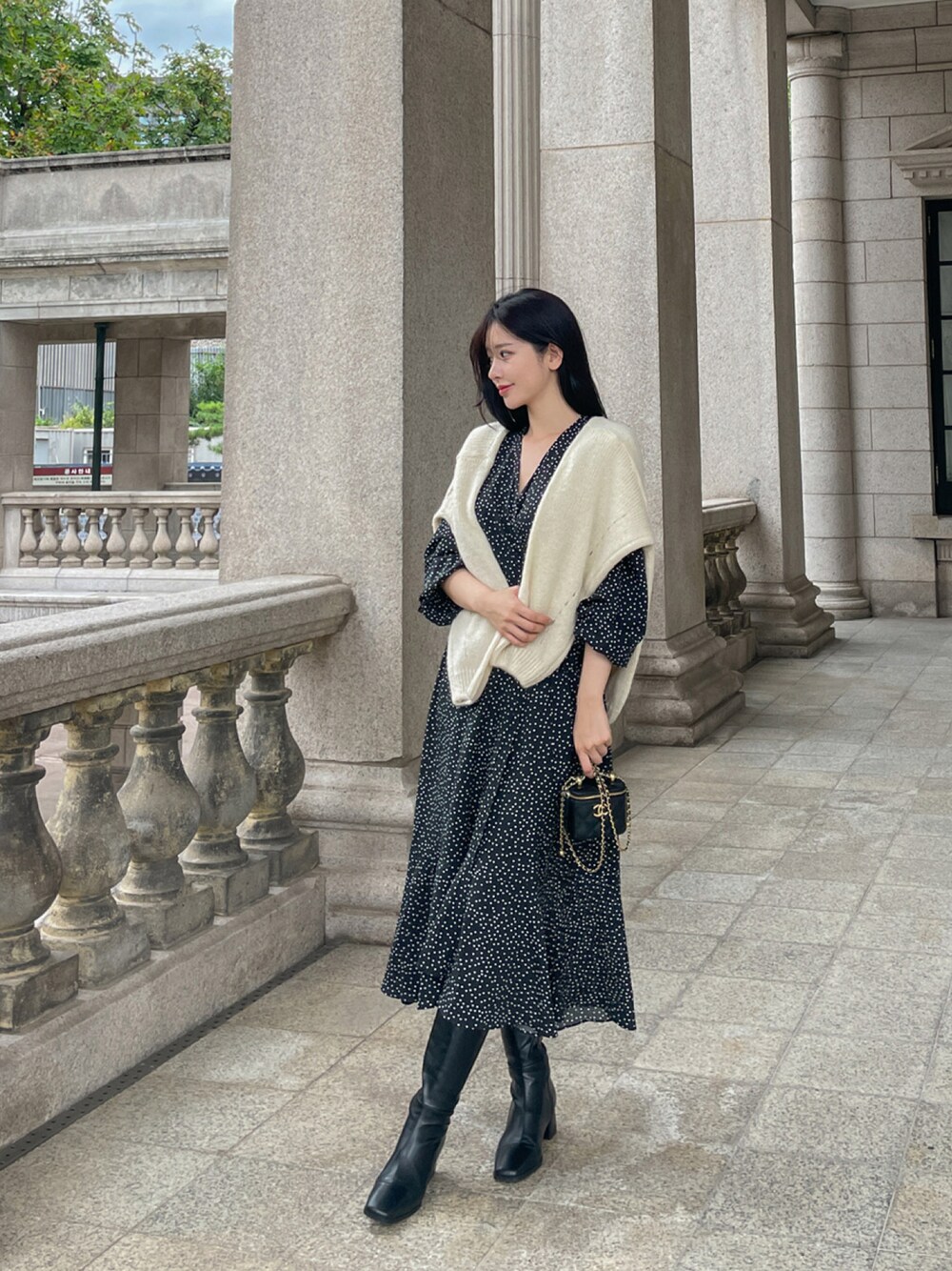今日の新着 ドット柄アンバランス丈ワンピース X オーバーフィットロングニット 今HPで5%新着割引中📢 @maybins_japan