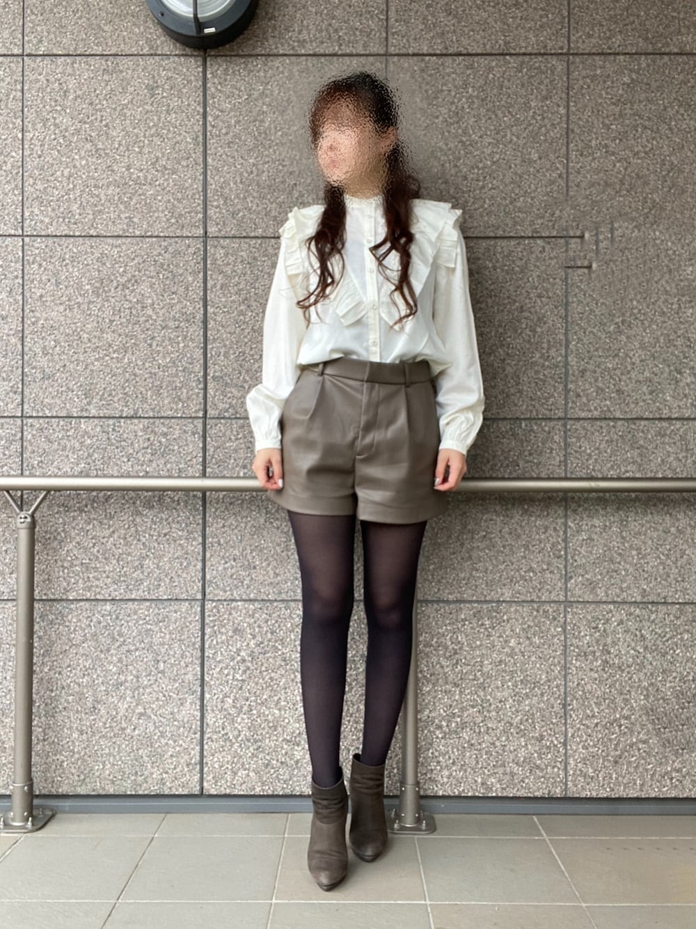 レザーのショートパンツ率高め✨ 寒いけどフリルブラウスが着たくて❤️ いつも「いいね♡」「save+」「フォロー+」ありがとうございます😊💕