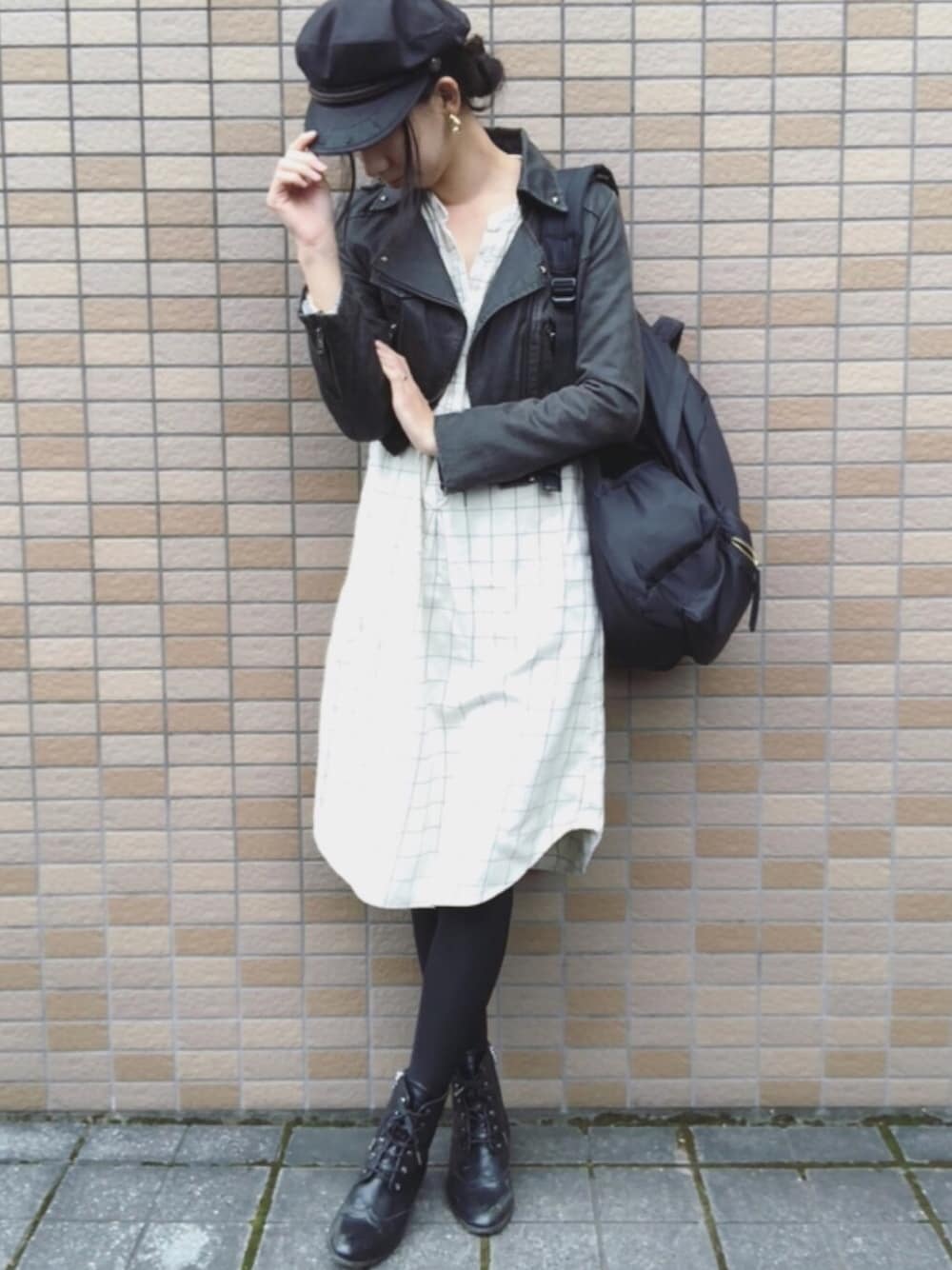 ご覧いただきありがとうございます。 ノーカラーのシャツワンピ。 冬の白、好きです♡ ショート丈のライダースにリュック合わせでカジュアルめに。