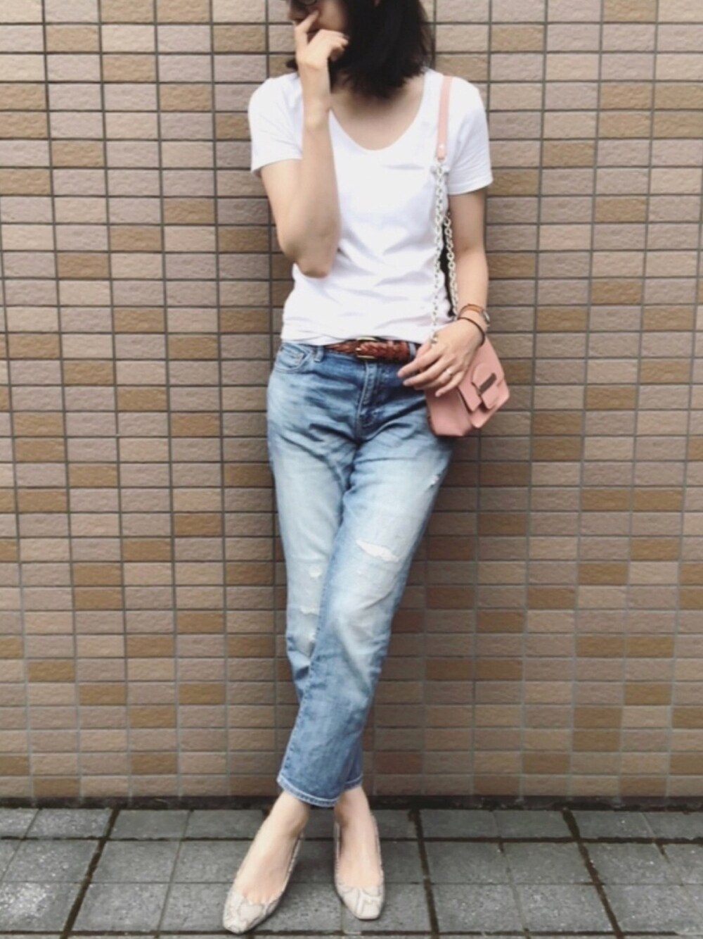どしんぷる。 ダメージデニムの時は、uniqloUよりGAPの白T。 鎖骨ラインを綺麗に見せてくれるUネック♡