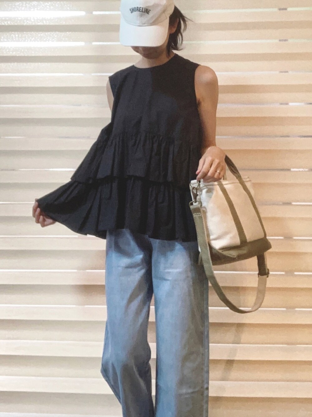 甘めのトップスには デニムとキャップとトートバッグでカジュアルダウンが落ち着く♡