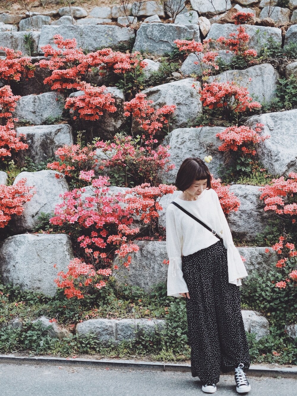 ブラック系のシューズを着用したレディースの春コーディネートの1枚目の写真