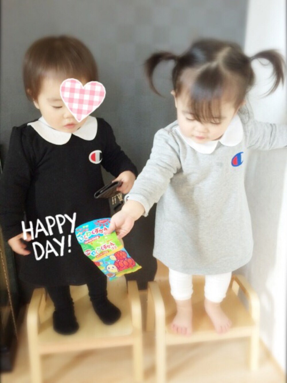 お友達と双子コーデ👭靴もコンバースでおそろ💕近くにしまむらがないから買ってきてもらったの、今日は暖かいからやっと着せれた😊丸襟がお上品でかわいいし首がゴムだから着せやすい👏友達の娘ちゃん髪が綺麗な茶色うらやましー😊💕