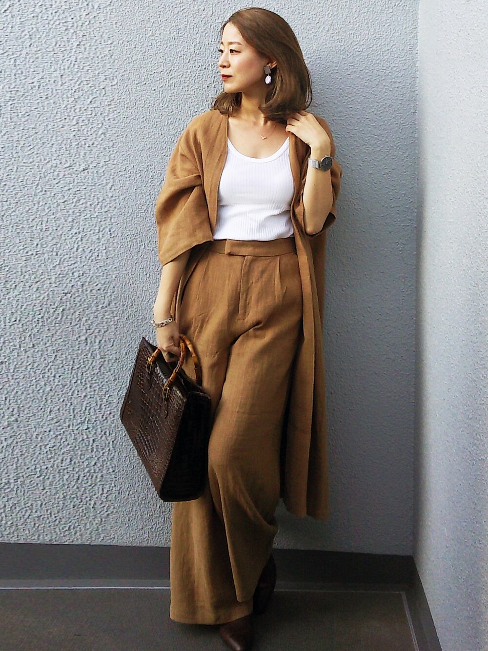 NICOのノーカラージャケット「リネンノーカラーロングコート」を使ったコーディネート