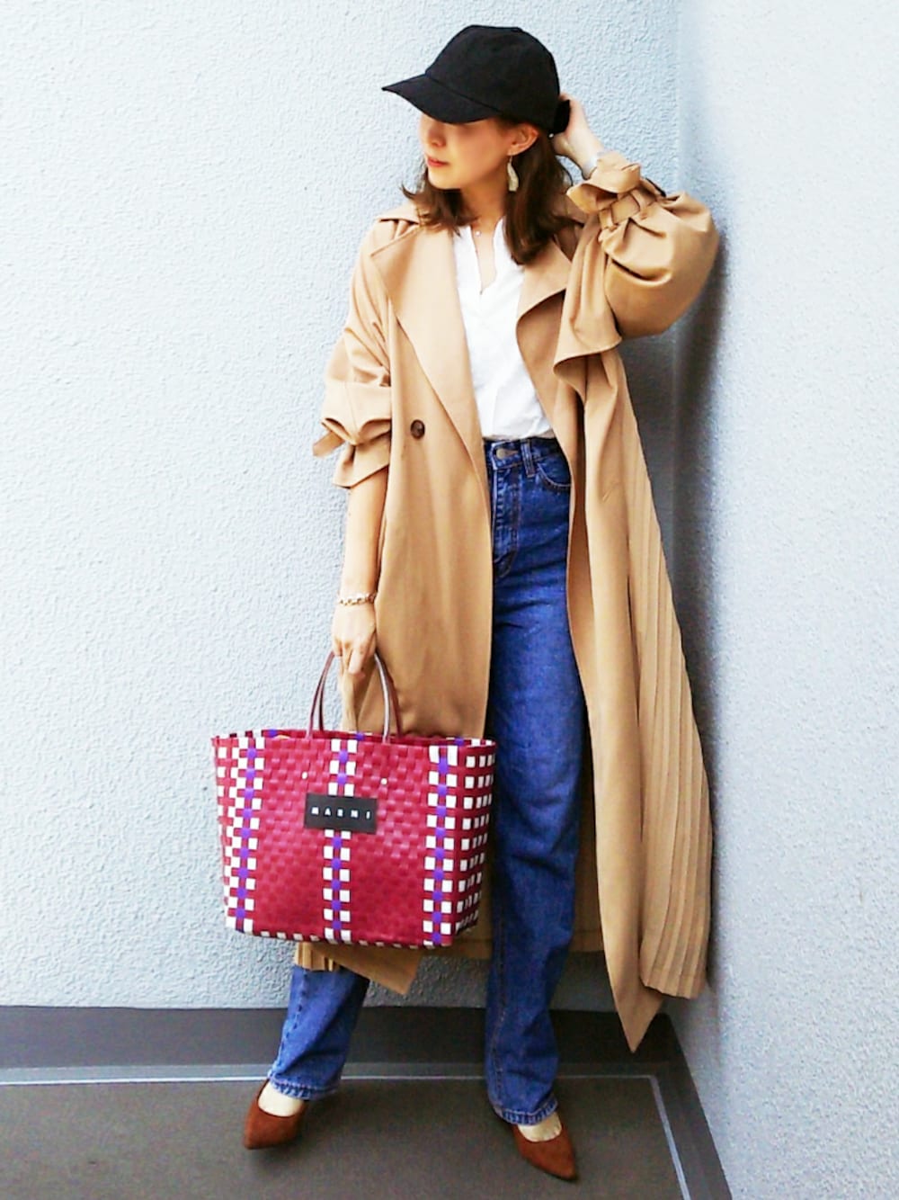 おはようございます😊 先日コーデです。 春だから、かごバッグもトレンチも出したのに。なんでこんなに寒いんだ😨 今日も頑張っていきましょう🙌